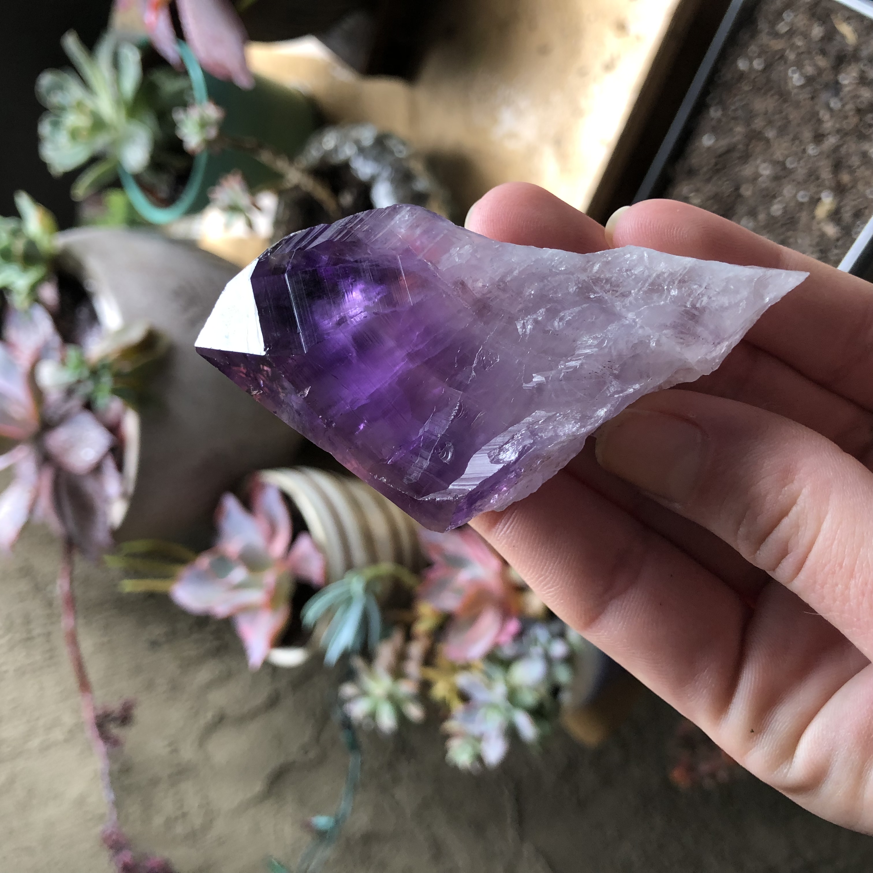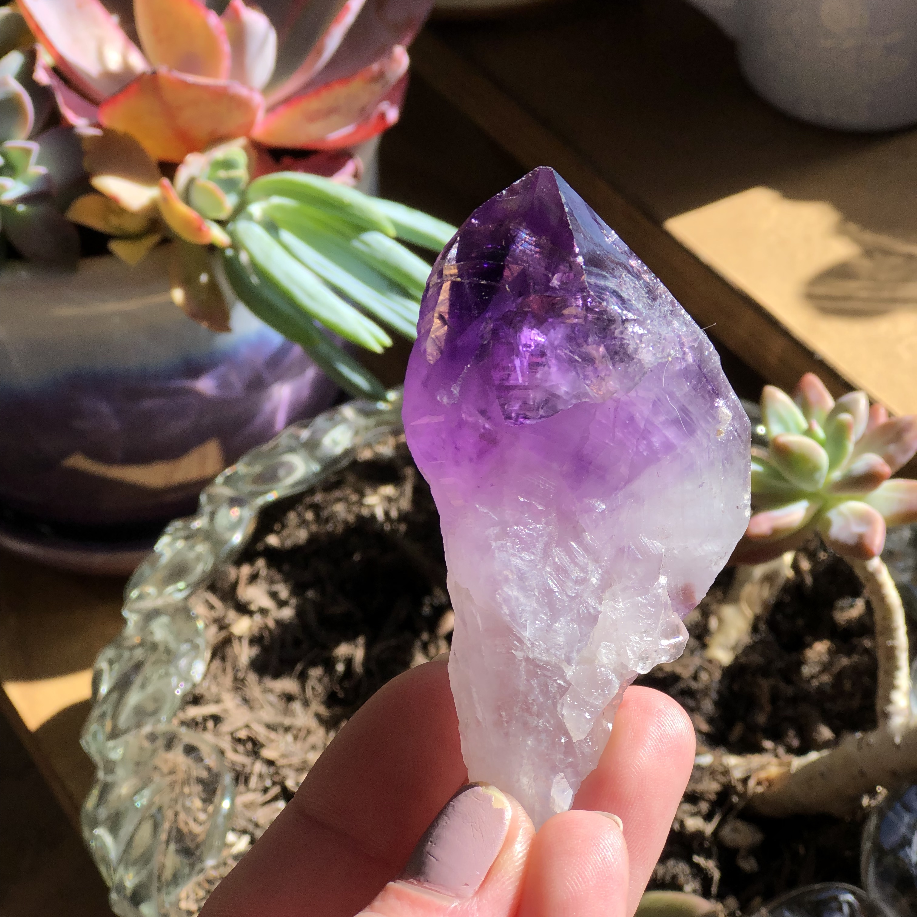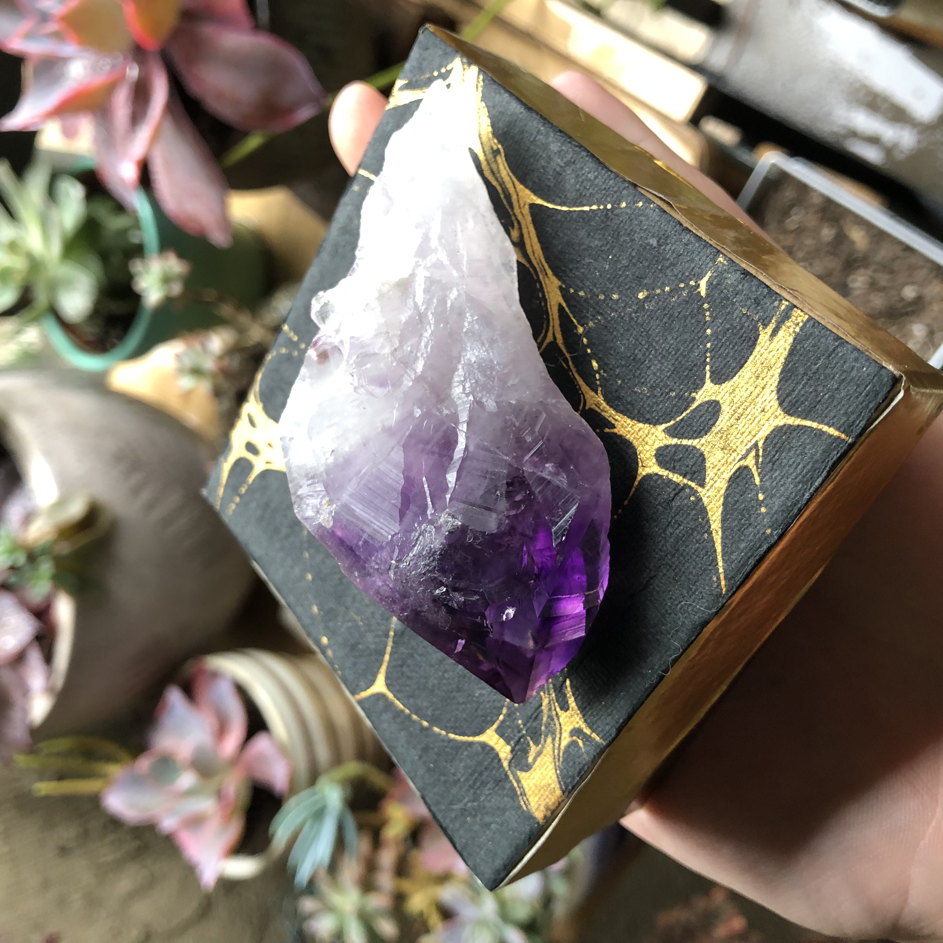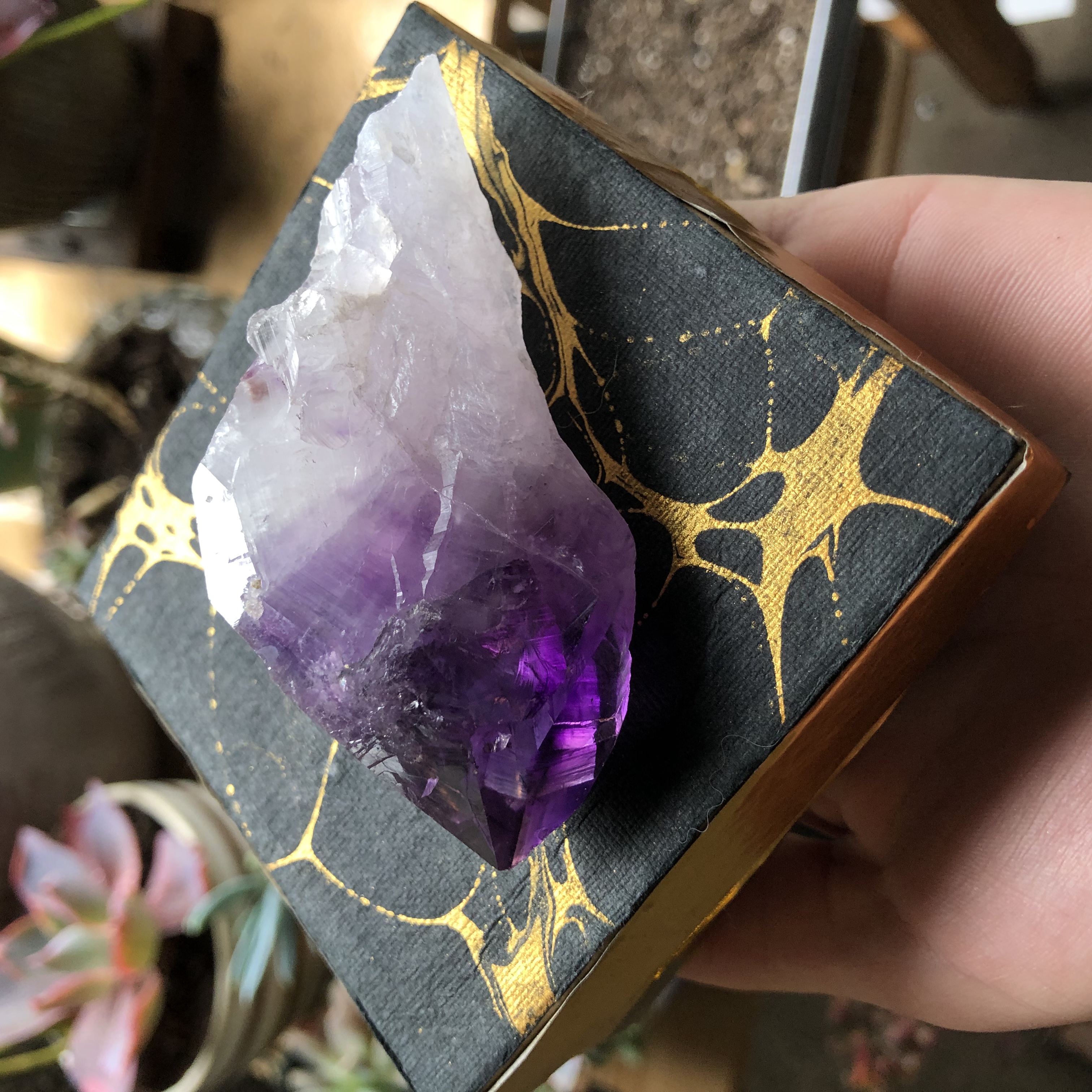 This large natural amethyst point crystal has a stunning purple glow to it. Comes with a hand made gift box.