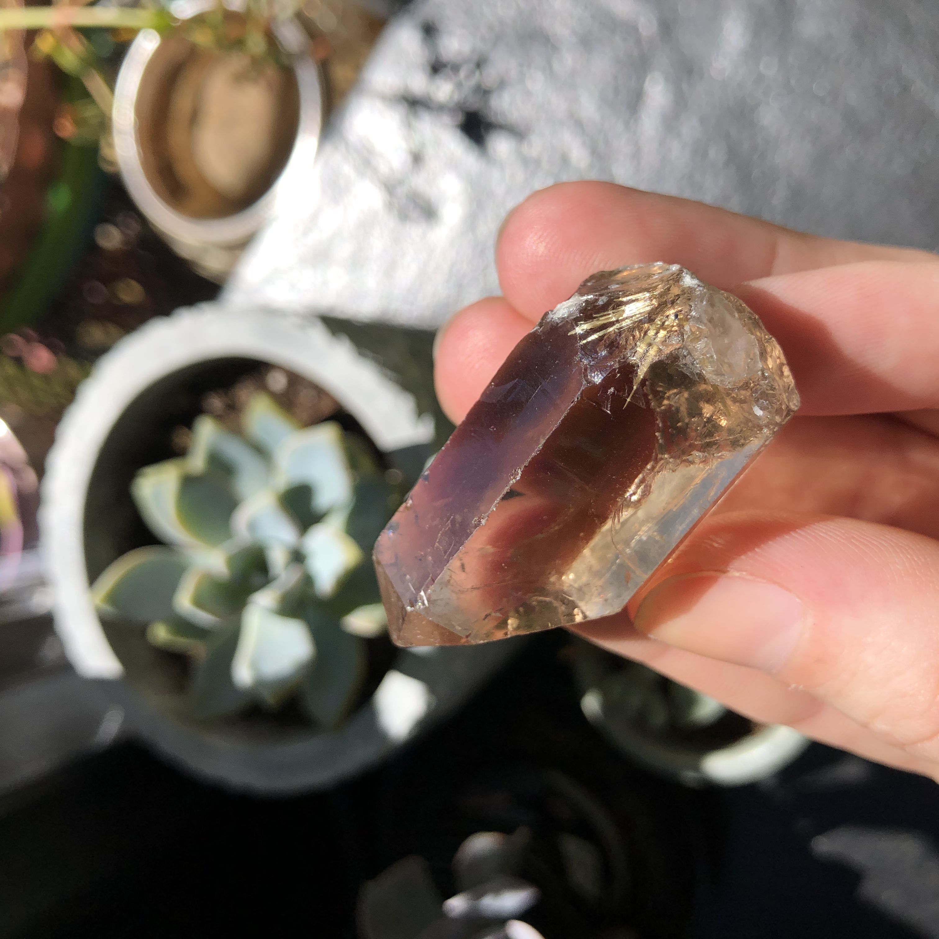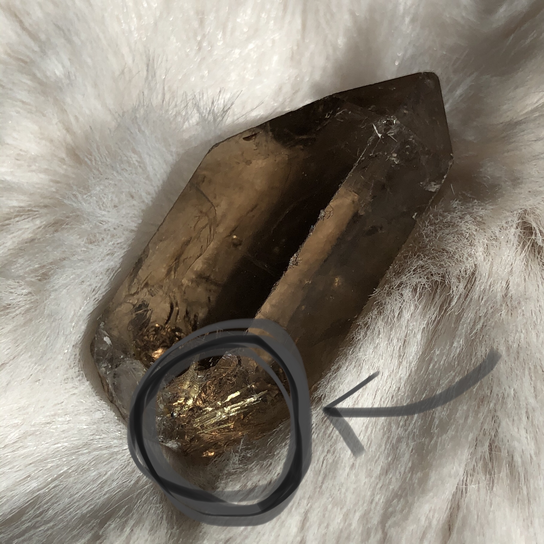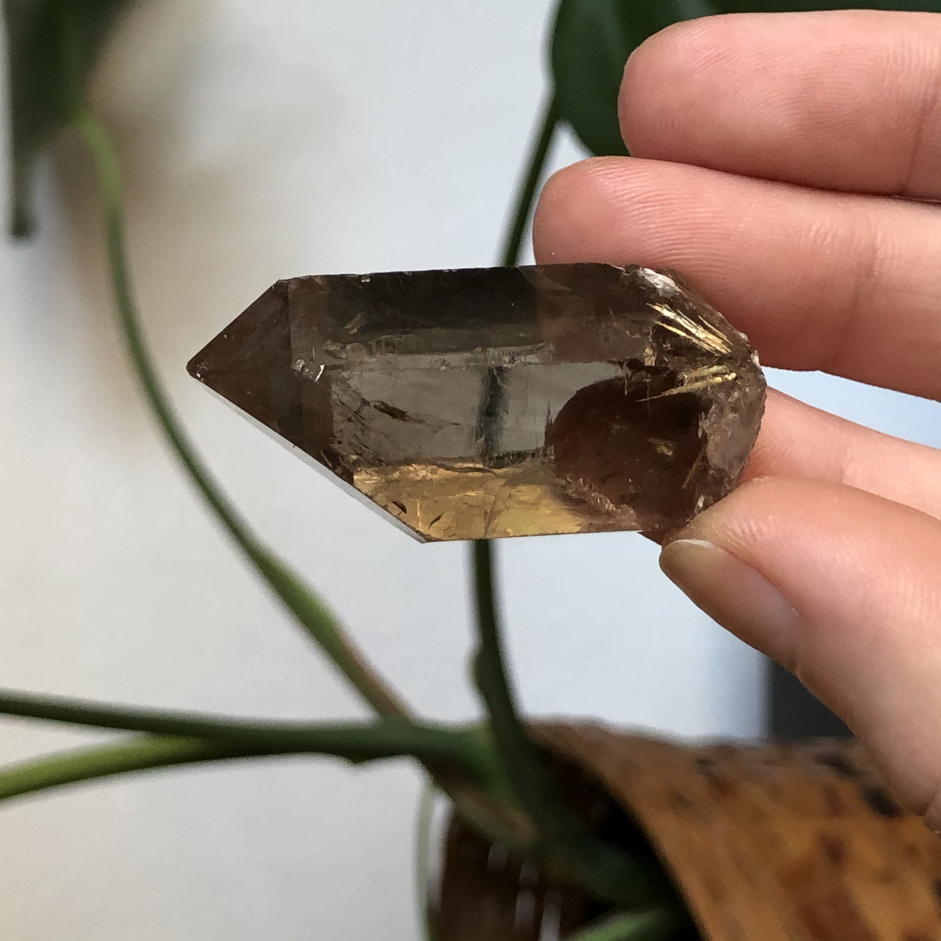 A gorgeous smoky quartz crystal point, with natural Rutilated-strands visible forming in the base :)