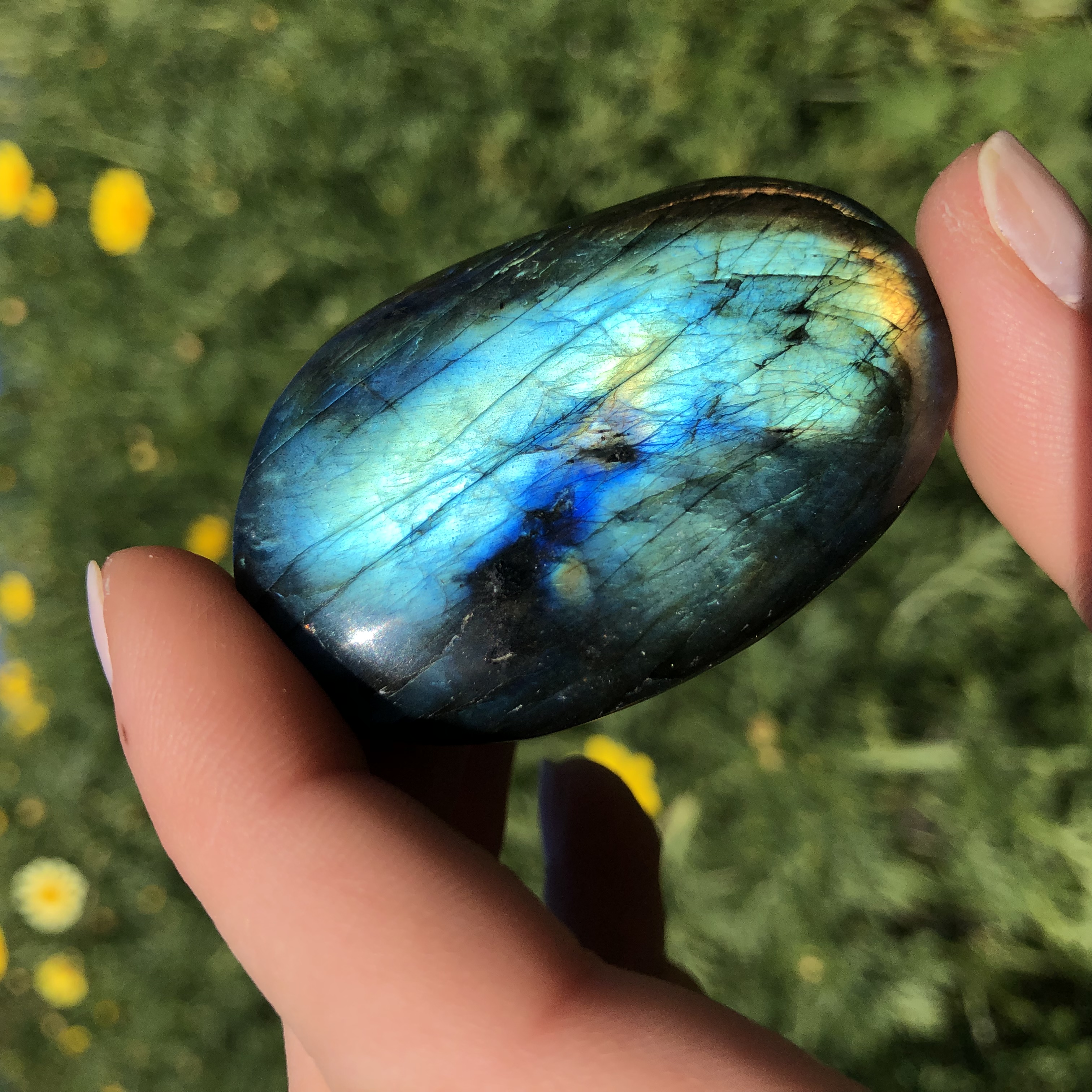 BRILLIANT BLUE FLASH. Quality blue flash, on this fully polished Labradorite stone. The flashing colors are eye-catching and captivating, bringing a calm or electric energy to anyone who needs it. There is even a hint of pink on one of the edges of the color-flashing stone, as shown in one of the pictures.