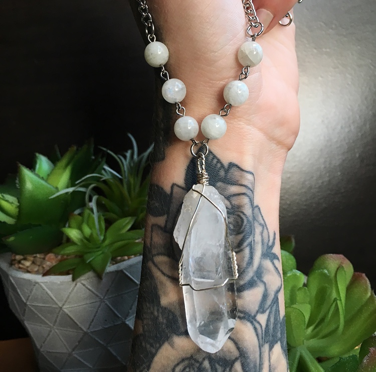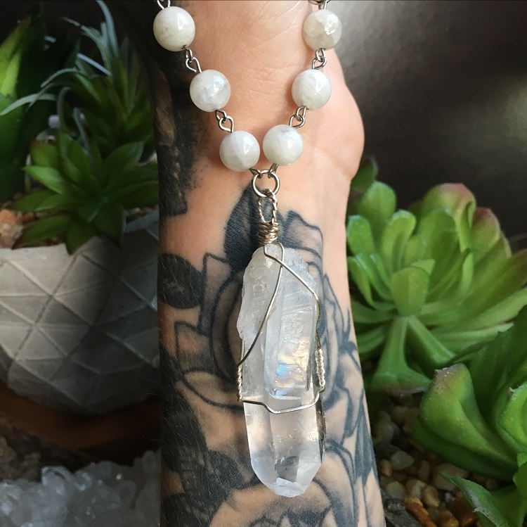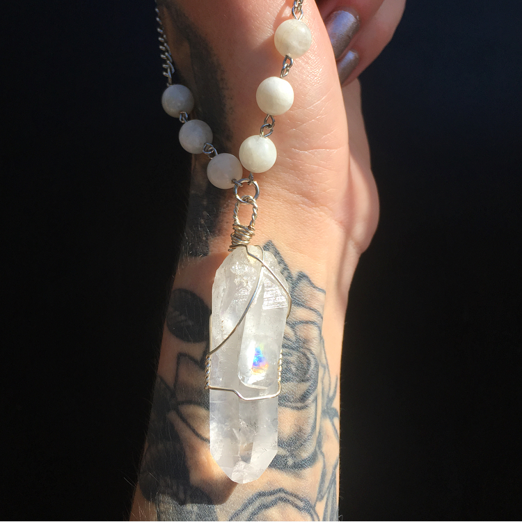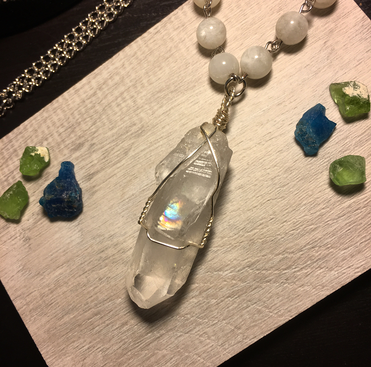 This Crystal quartz point has a crystal growing on it that is completely amplifying the rainbow in between. Paired with six Moonstone beads, and a longer chain.