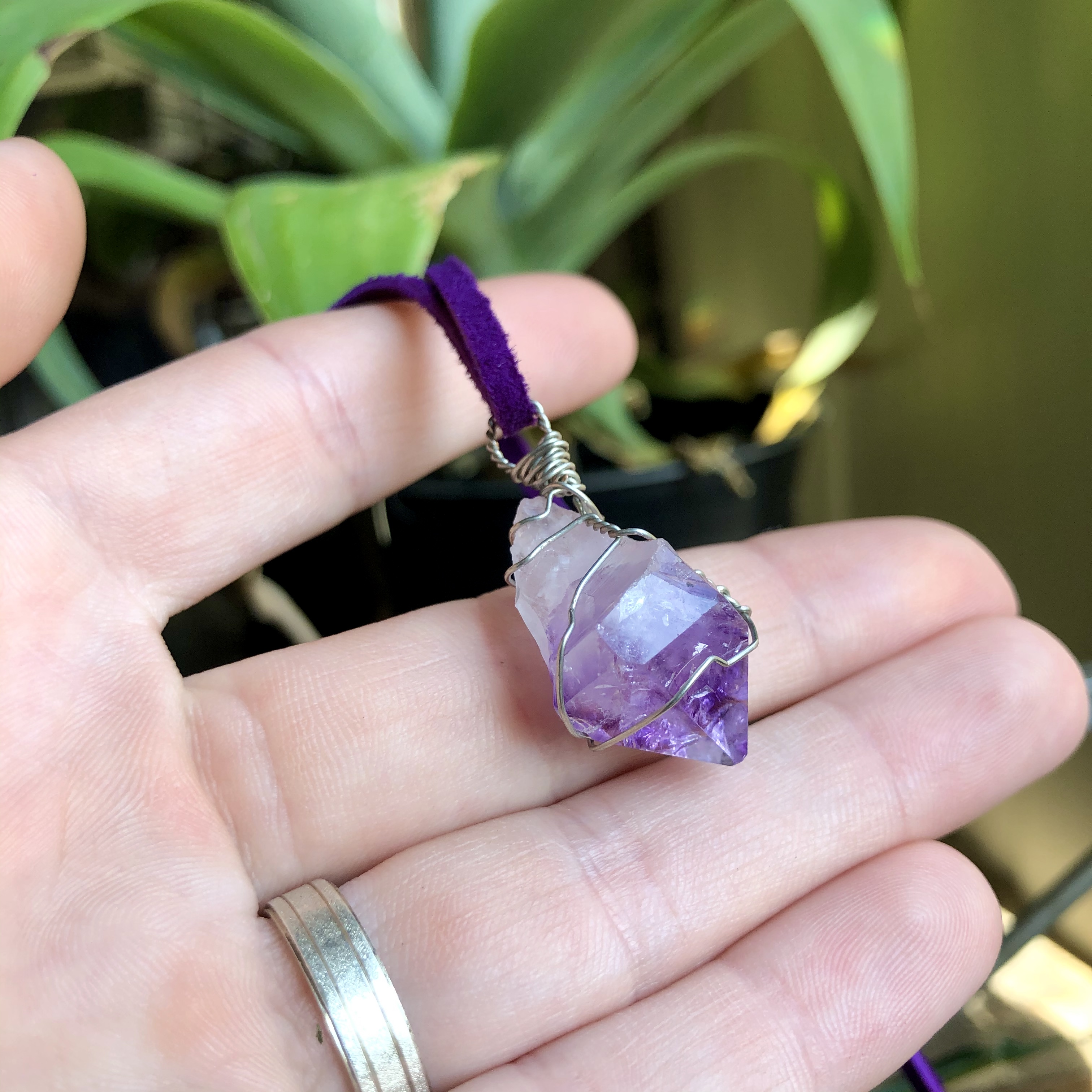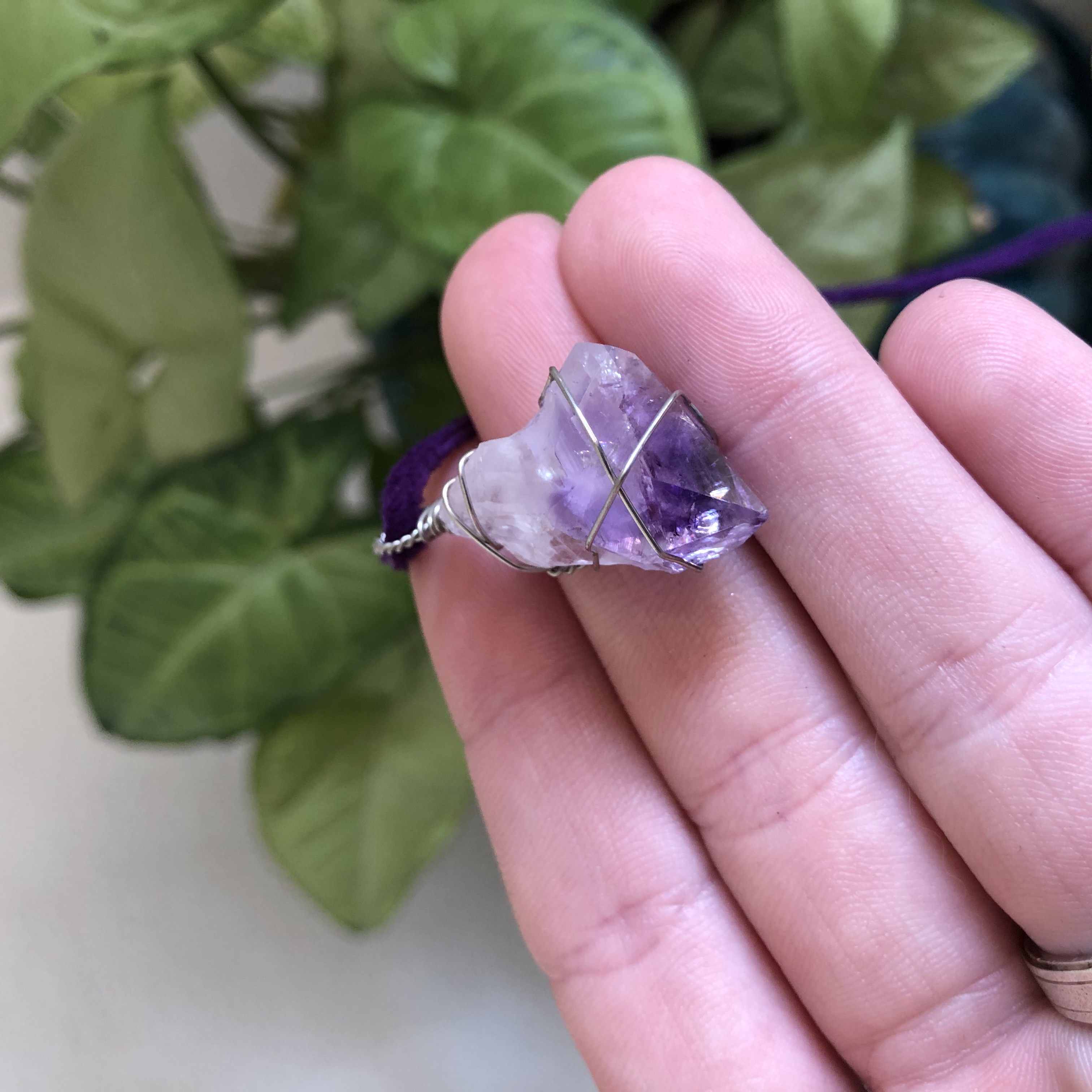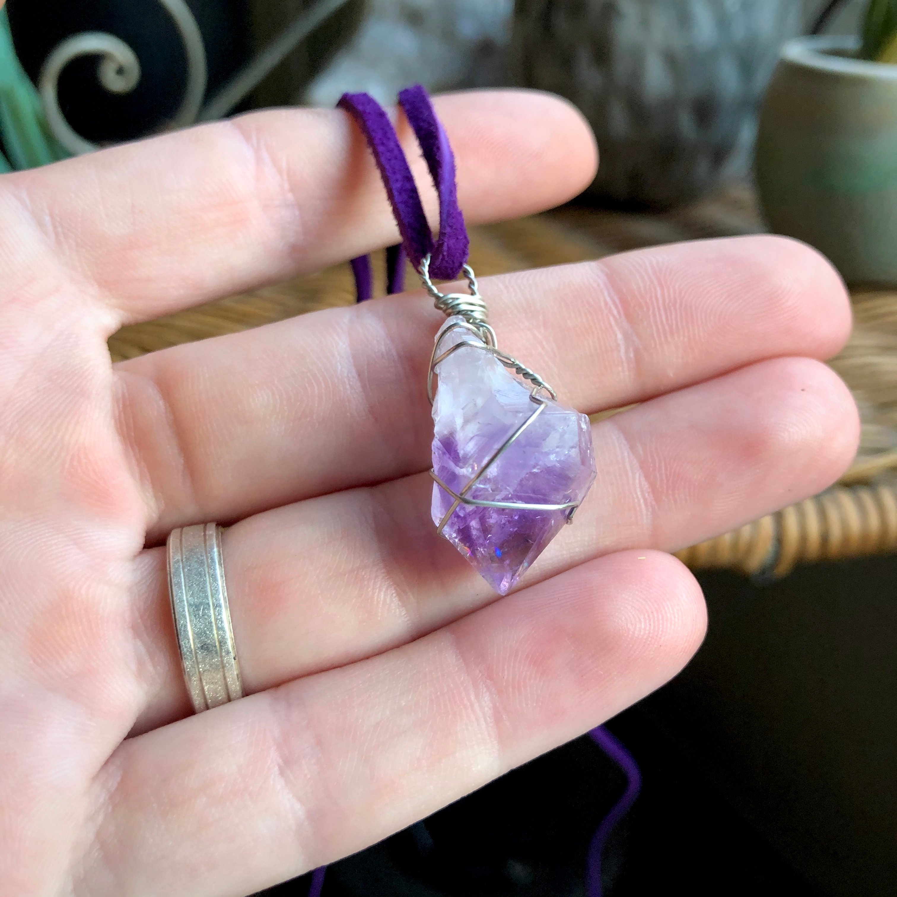 Comes on an adjustable-length purple chord, Amethyst crystal necklace.