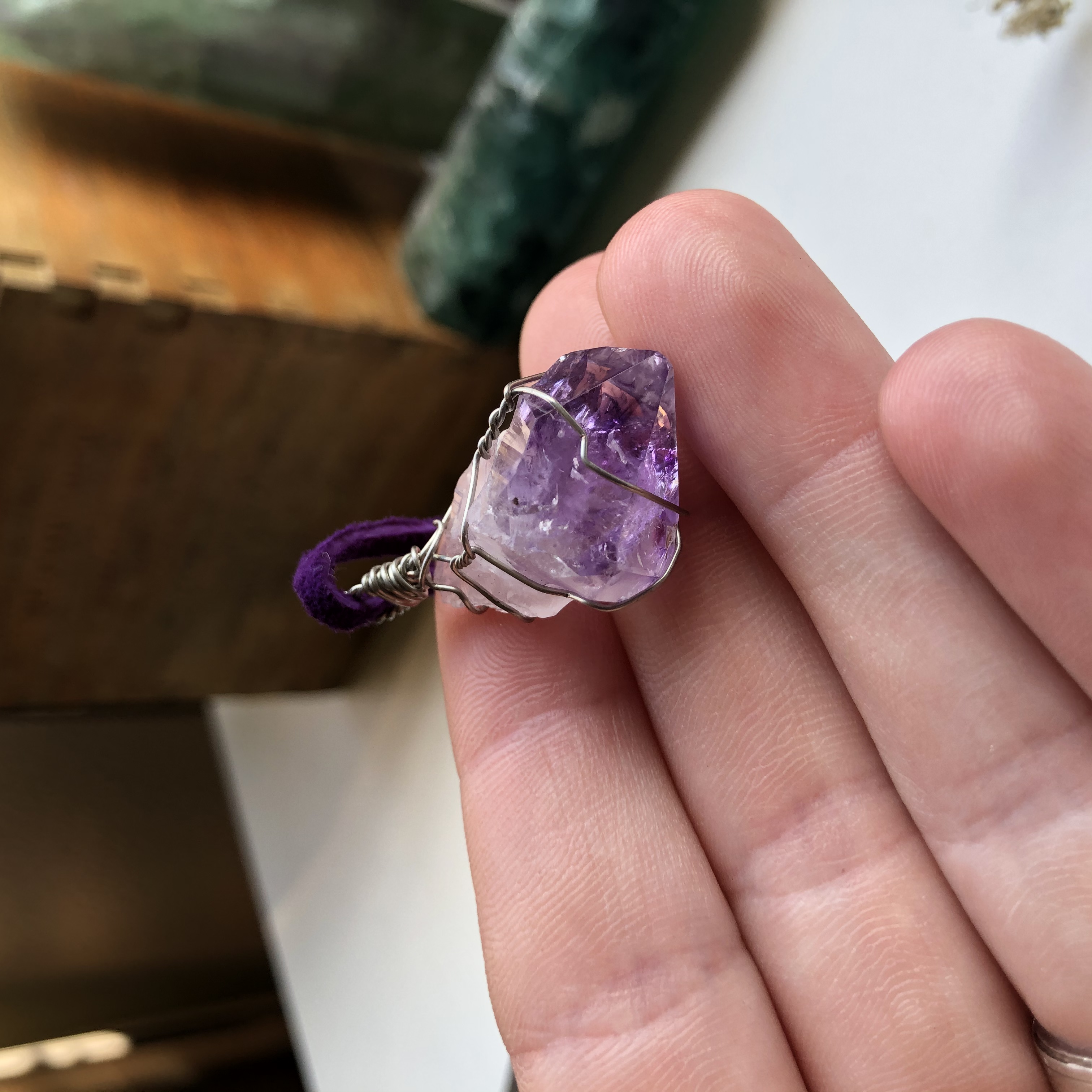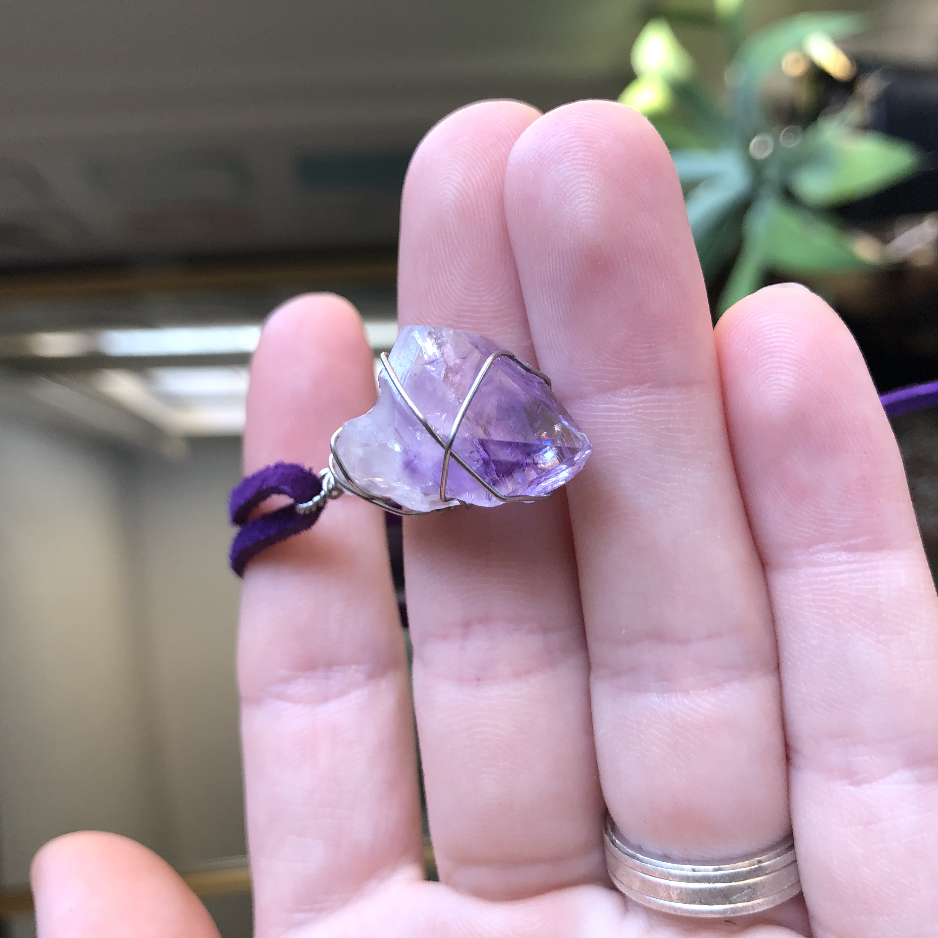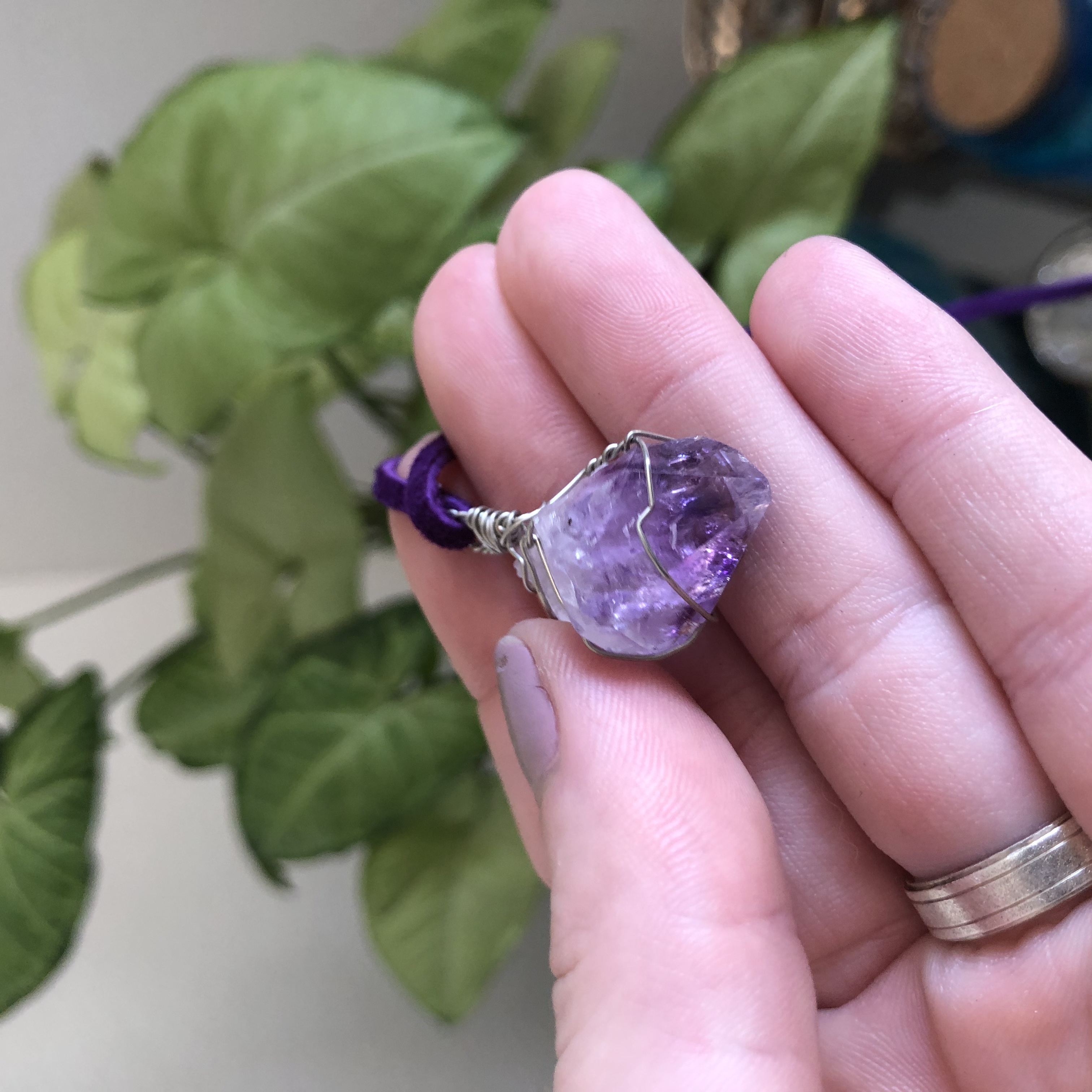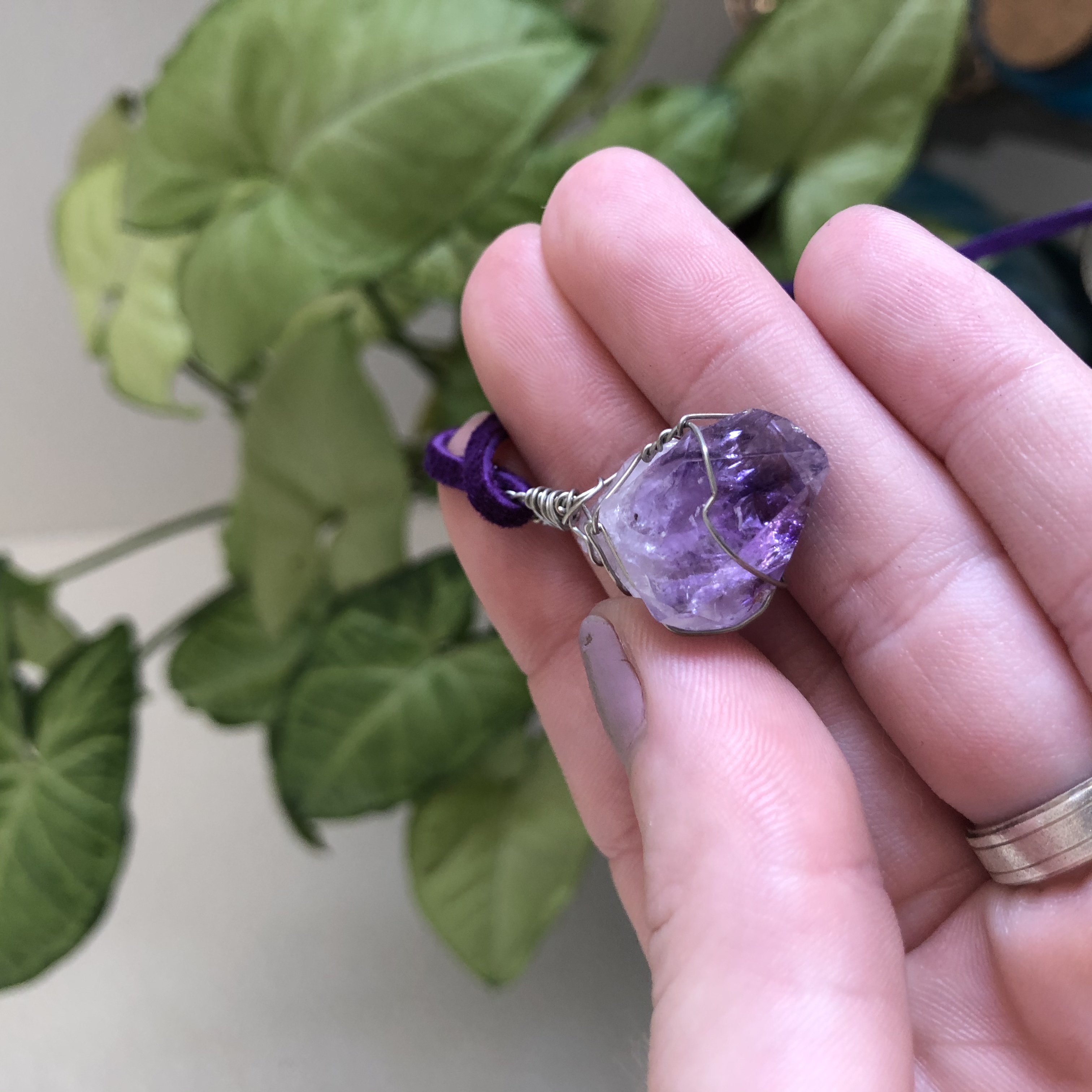 Comes on an adjustable-length purple chord, Amethyst crystal necklace.