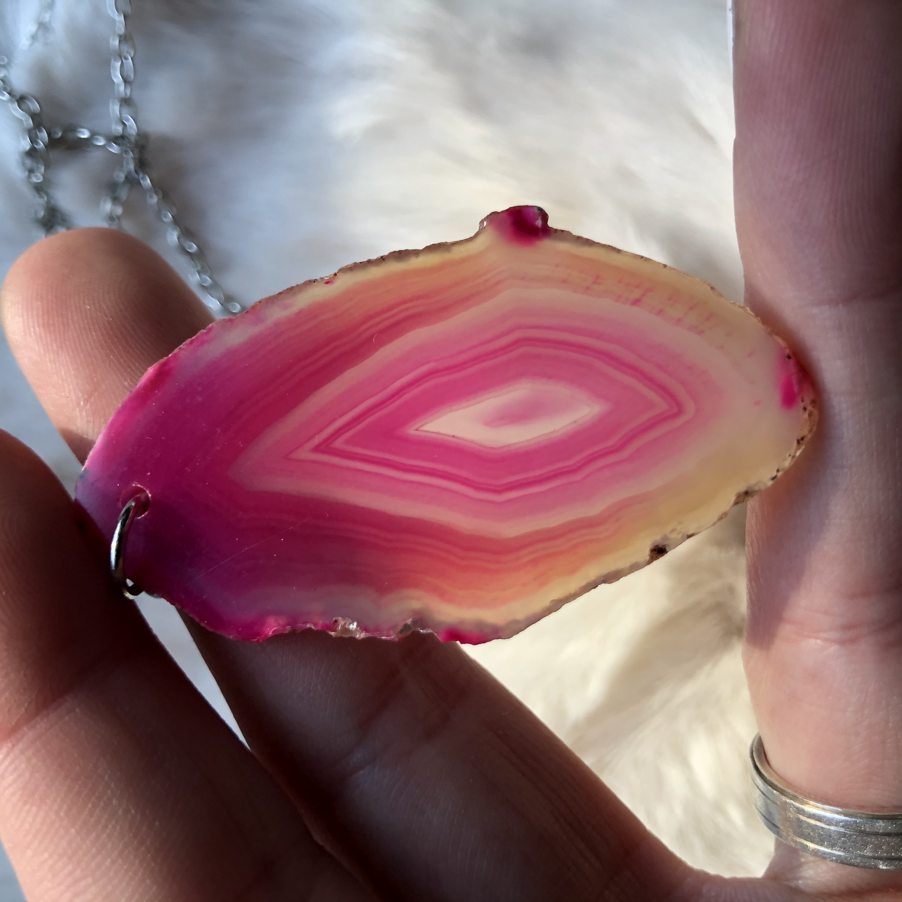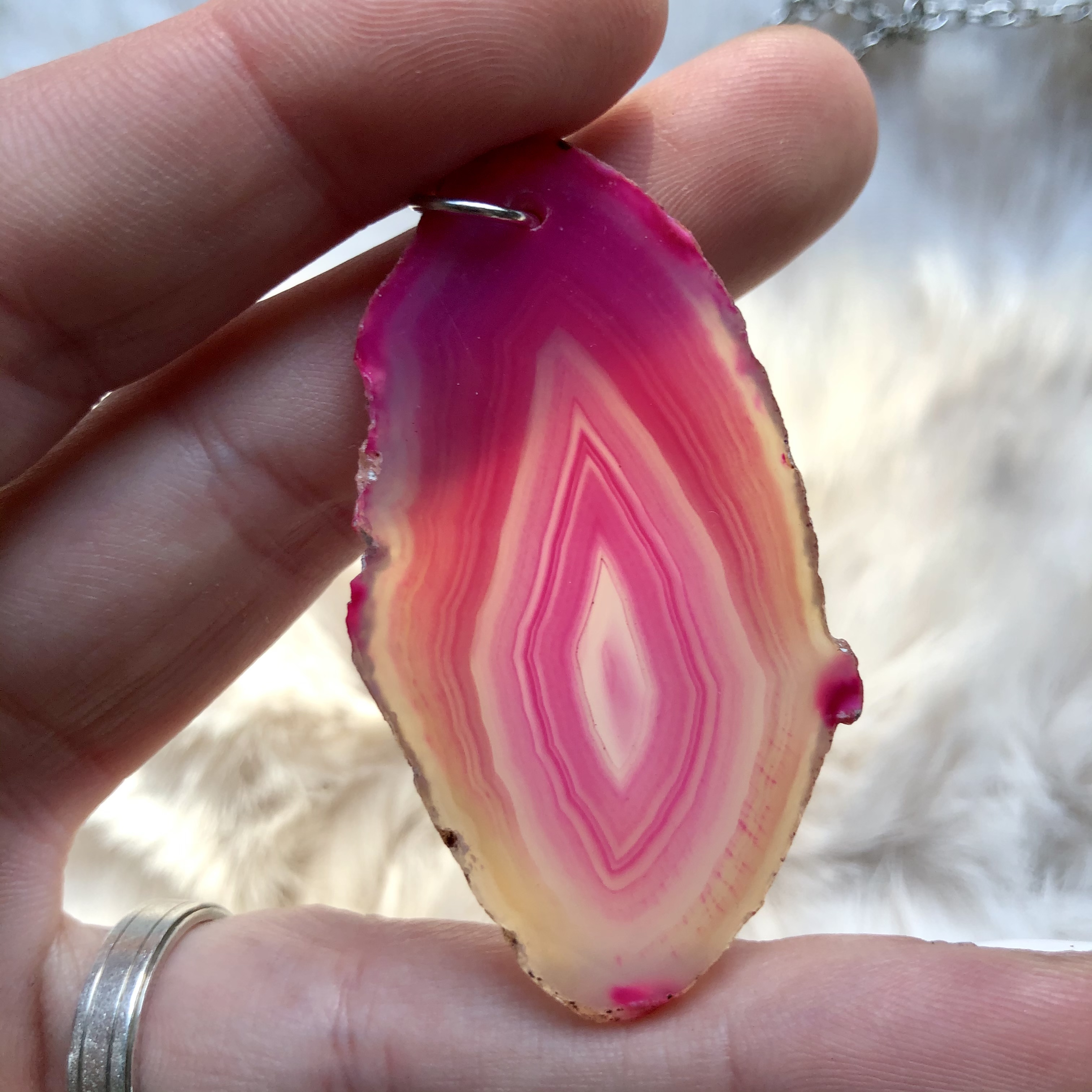 This agate Crystal has a little bit of a Druzy Quartz center if you look closely :) Comes on a medium-length chain.