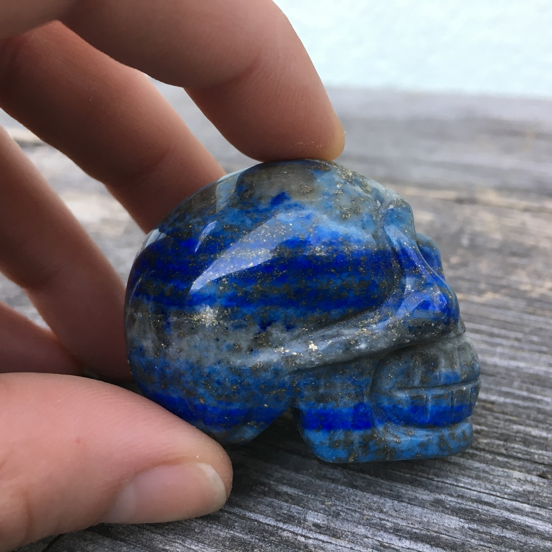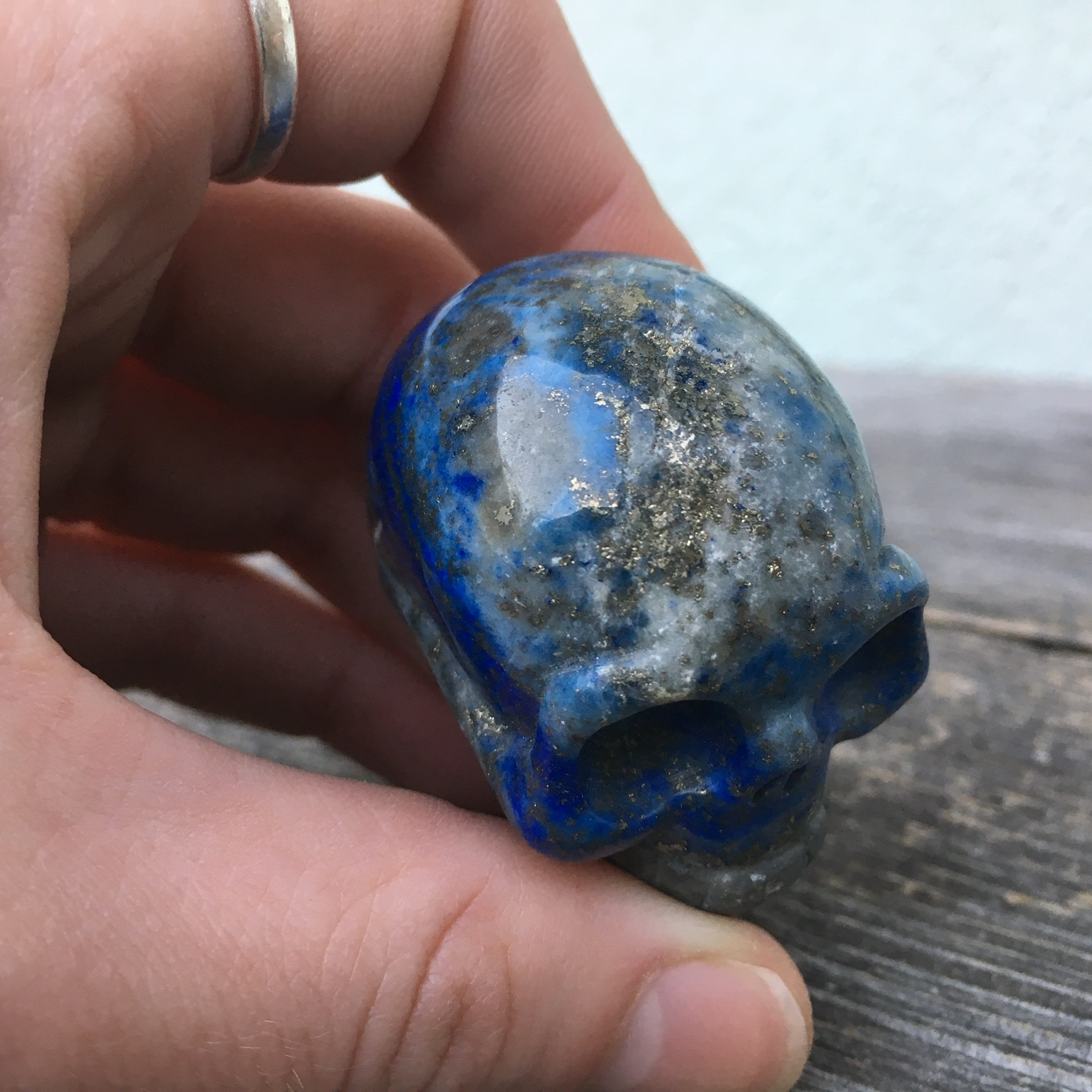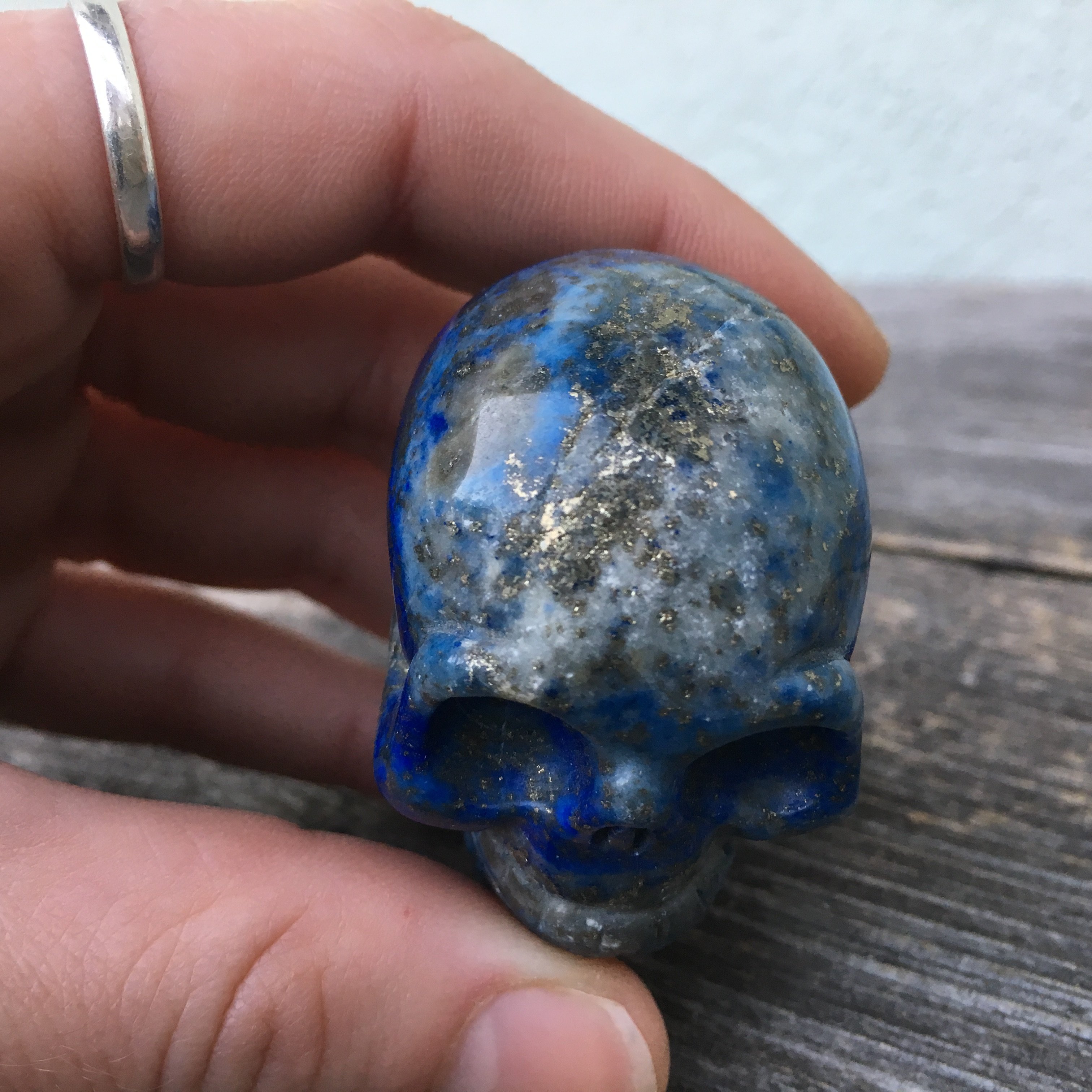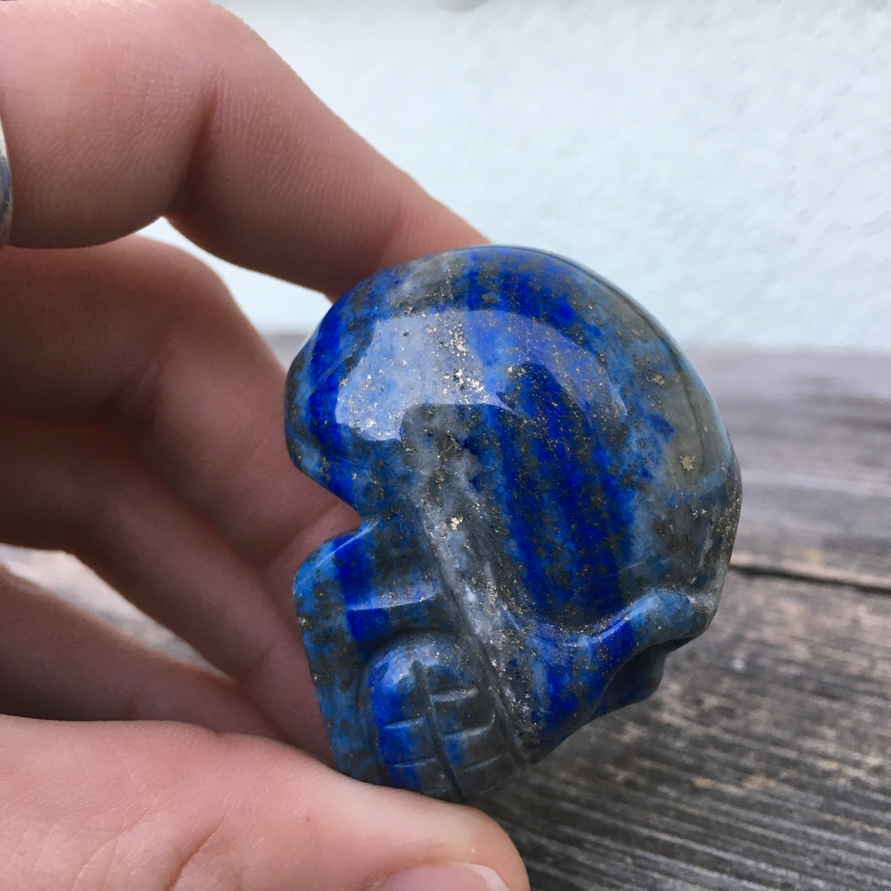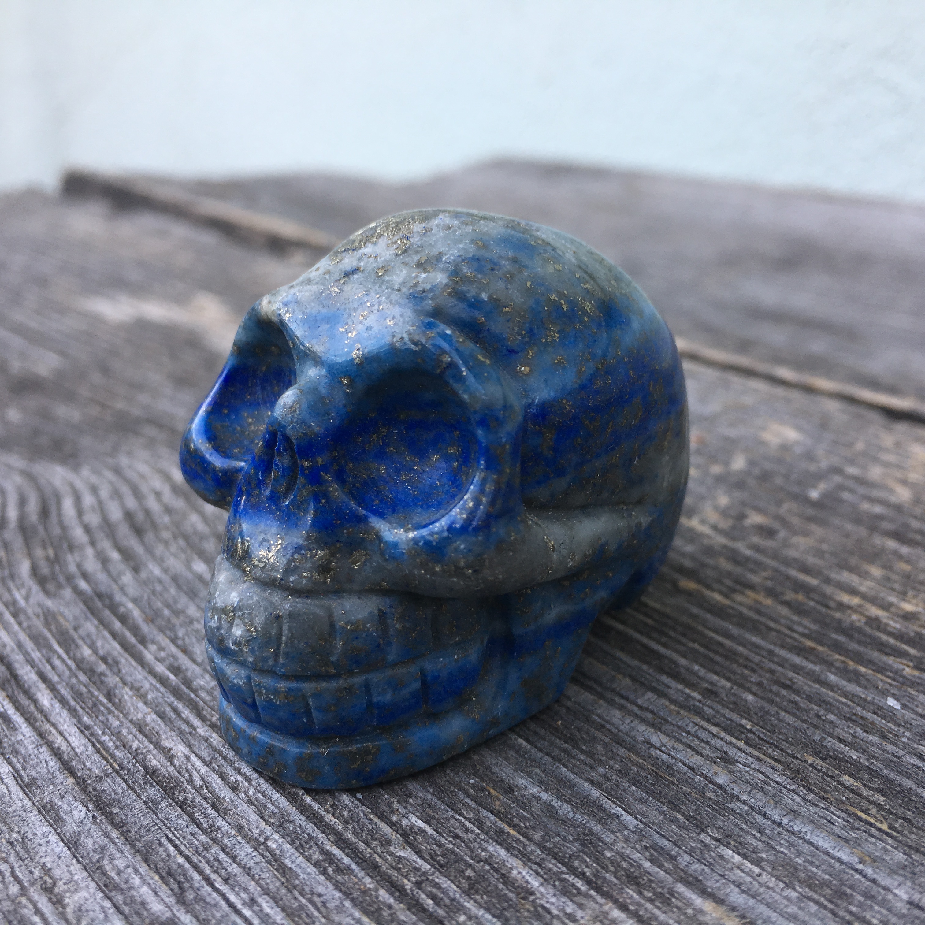 The stone Lapiz Lazuli is known to have a natural flakey sparkle to its blue composition, I was drawn to this particular crystal skull out of the bunch because of its vibrant natural coloring & its unique heavily-sparkling top!