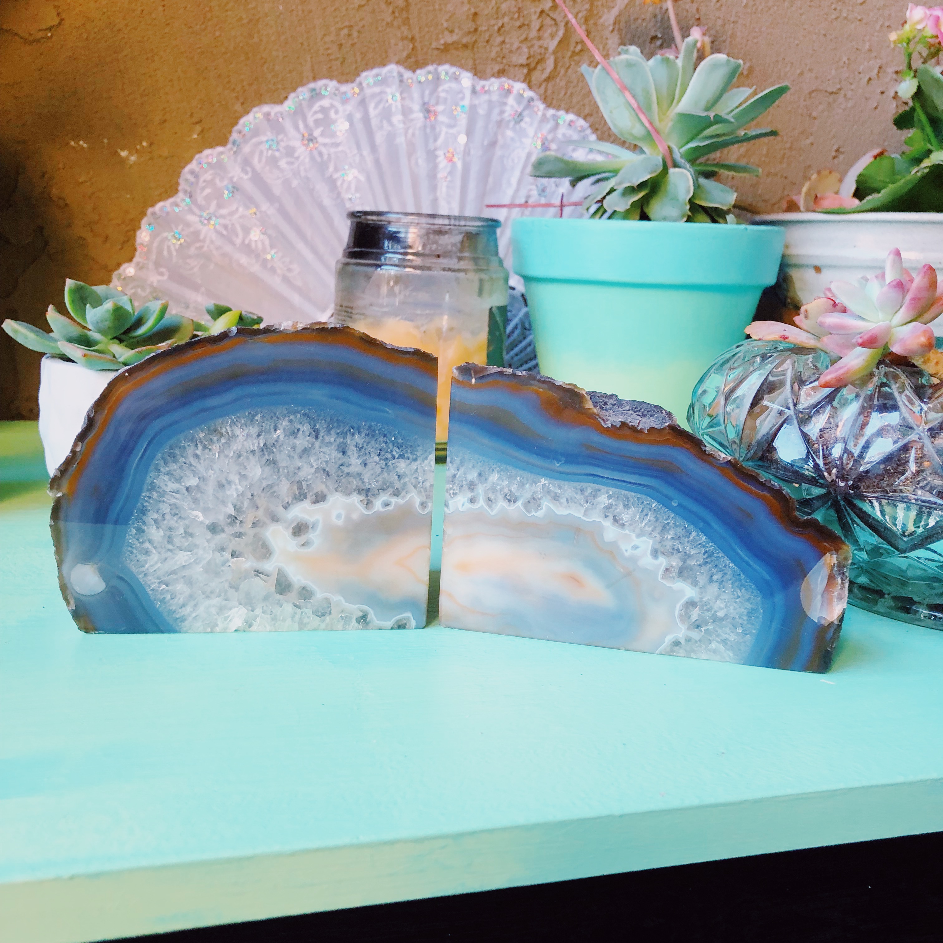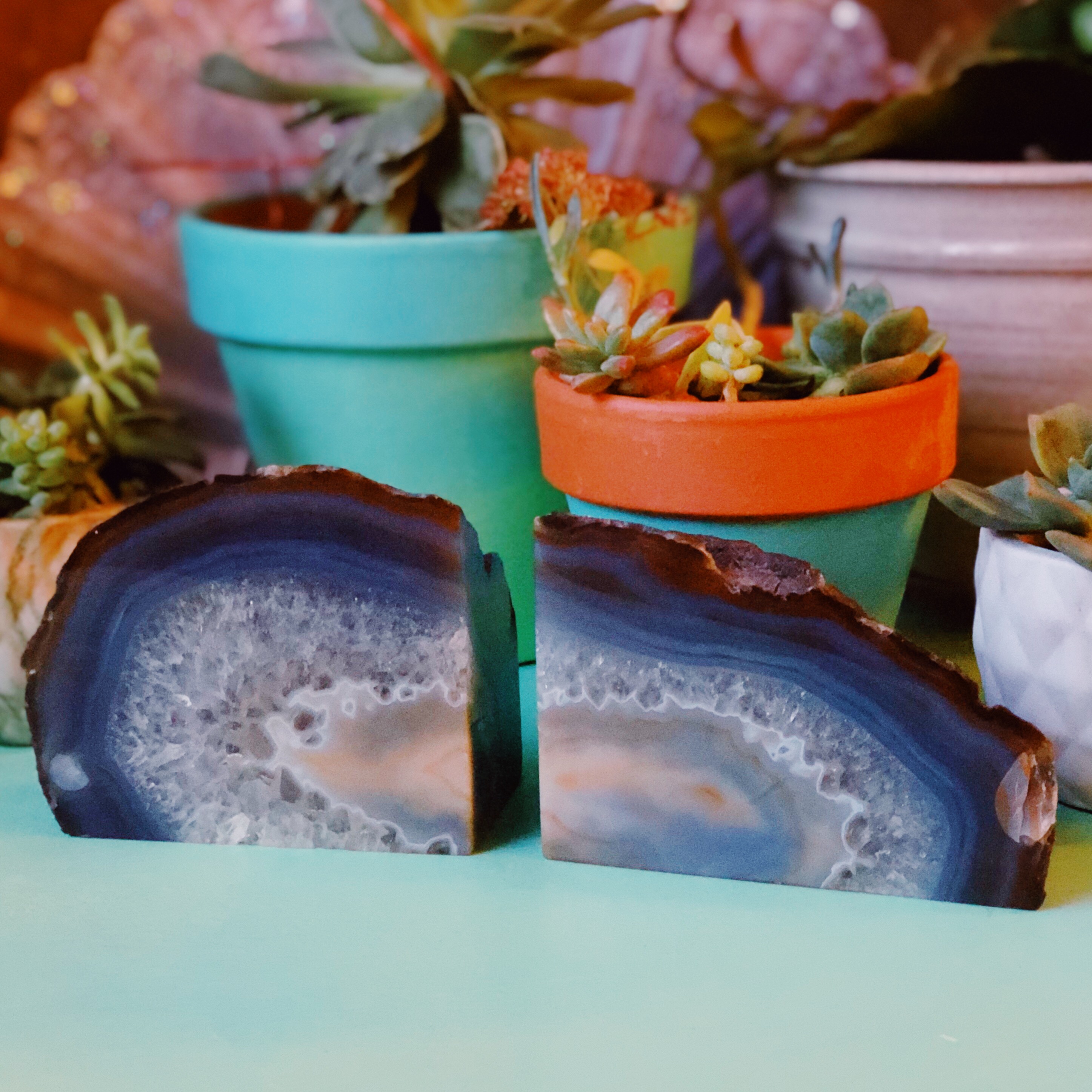 This pair of crystal book holders will look beautiful in any environment. The Agate crystal geode has a crystal quartz center that has clear rainbows, and then the very center is Agate again, displaying a mountain-like scenery.