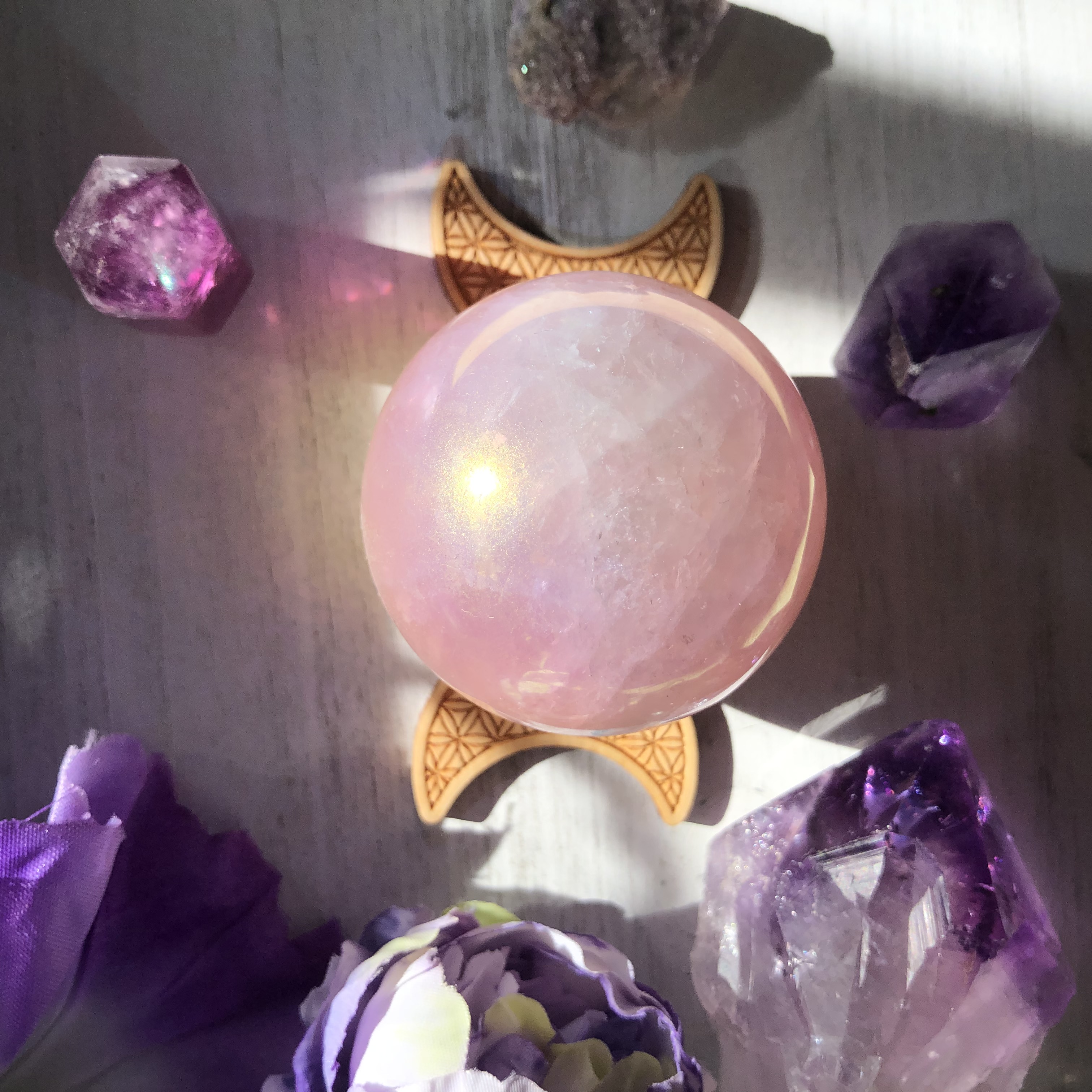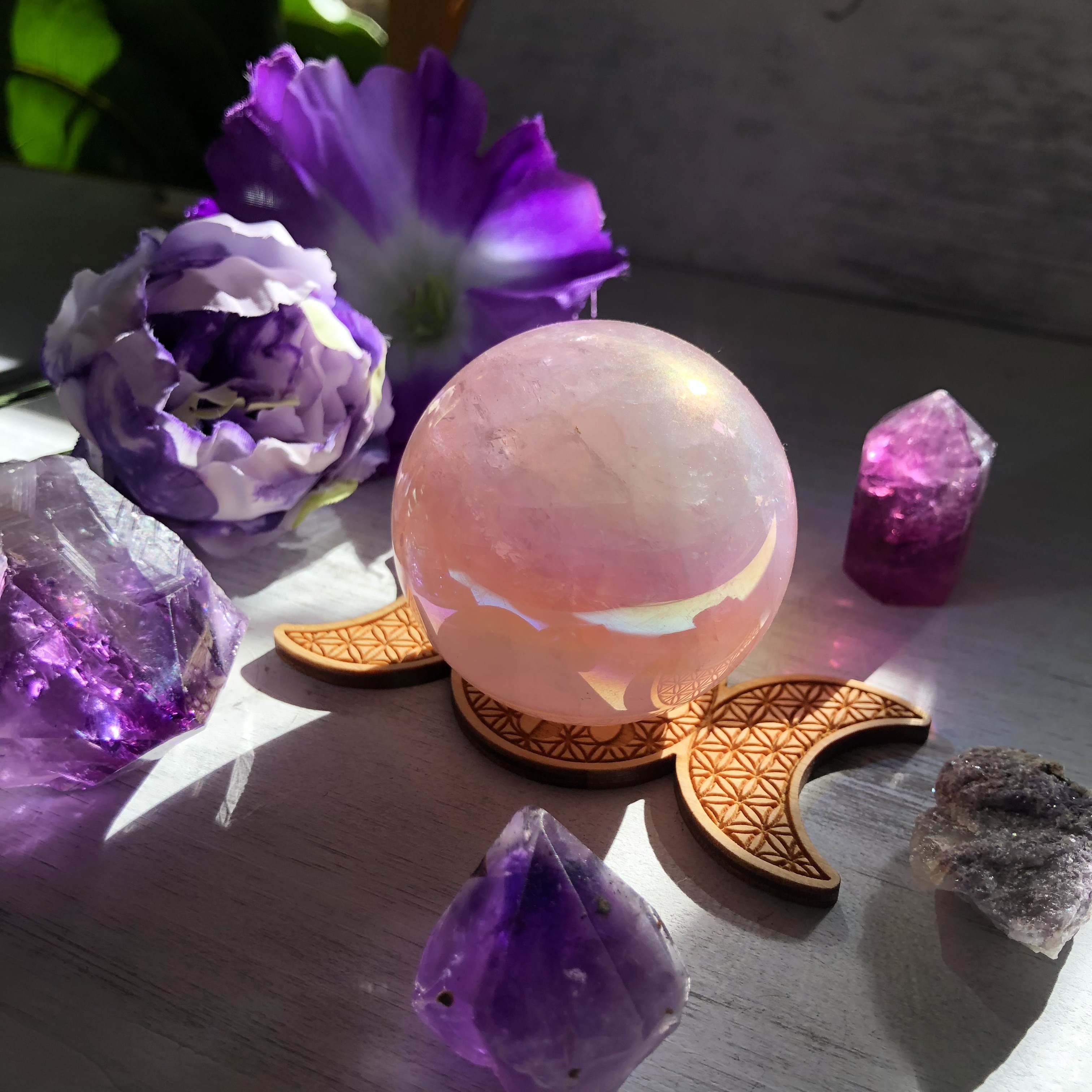 This order comes with a glowing Aura Rose Quartz with the wooden moon-phases base, crystal ball holder.